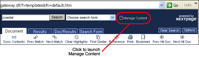 You can launch Manage Content directly from your NXT 4 site, on the right-hand side of the NXT 4 search area (Figure 1). Click on Manage Content to launch the Manage Content utility (Figure 2). Manage Content launches to the root of your site (site node) or to the folder of the last document you opened on your site. Manage Content retains this launch location throughout your browser session until you open a different document from the table of contents or search result list, or until you close your browser.