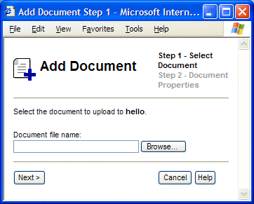 Like ccBuild, you can add documents to your content collection only from your file system. However, unlike ccBuild that can add multiple documents at once to a content collection, Manage Content adds one document at a time. Adding a document to a content collection with Manage Content is a two-step process. To add a document to your content collection with Manage Content, click the Add Document icon or title. When you do this, the dialog for step 1 in Figure 4 appears.